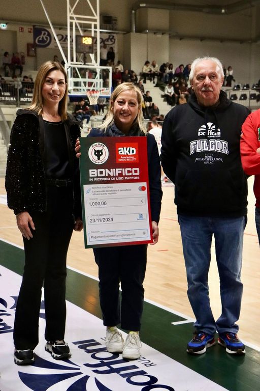 Come sempre solidarietà e sociale protagonisti del sabato sera al Pala Cipir. L’Ugo Paffoni Day è stato molto di più di una semplice partita, per altro vinta dalla squadra di casa. Nell’intervallo della partita, dopo lo splendido spettacolo messo in scena da Arcademia per ricordare l’uomo che ha portato la Fulgor ai massimi livelli del basket italiano, è stato consegnato simbolicamente alle figlie Francesca e Daniela l’assegno di 1000 euro che la Akb ha donato in ricordo di Ugo Paffoni come borse di studio a quattro famiglie. Molto apprezzata anche l’esecuzione dell’Inno d’Italia da parte degli studenti del musicale del Gobetti così come la presenza delle ragazze dell’Omegna Pallavolo per la giornata contro la violenza sulle donne.