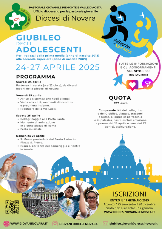 La quota di partecipazione, pari a 275 euro, include il kit del pellegrino, il viaggio, i trasporti a Roma, l’alloggio in parrocchia o in palestra, i pasti (ad eccezione della colazione e pranzo del 25 aprile e della cena del 27 aprile), e l’assicurazione. Le iscrizioni sono aperte fino al 17 gennaio 2025, con un acconto di 175 euro da versare entro il 20 dicembre 2024 e il saldo di 100 euro entro la scadenza. Maggiori info al sito.