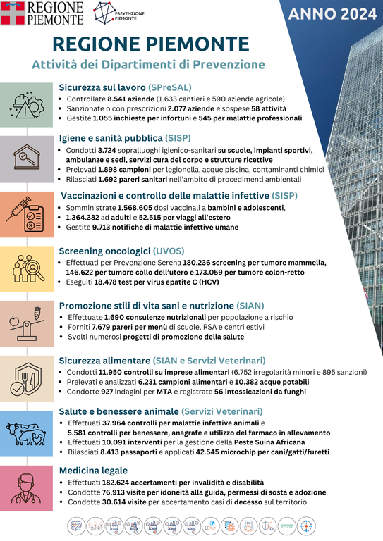 Da ricordare inoltre, grazie al lavoro dei Sisp (Servizio Igiene e Sanità Pubblica) e alle campagne vaccinali promosse su tutto il territorio, la somministrazione in Piemonte di 1.568.605 di vaccinazioni a bambini e adolescenti fino ai 18 anni di età e di 1.364.382 agli adulti; oltre ad aver effettuato quasi 4 mila sopralluoghi igienico-sanitari nelle strutture di uso collettivo e 1.900 campioni ambientali e su oggetti di uso comune.
