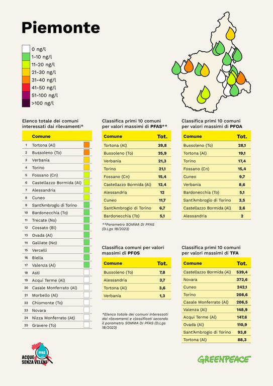 Verbania si trova tra i comuni piemontesi con le concentrazioni più elevate di Pfas nell'acqua potabile, secondo i campionamenti effettuati da Greenpeace. Queste sostanze chimiche, definite “permanenti” per la loro resistenza alla degradazione, possono accumularsi nell’organismo umano e nell’ambiente, causando effetti negativi sulla salute, come danni al fegato, problemi di fertilità, malattie della tiroide e persino un aumento del rischio di alcuni tipi di tumore.