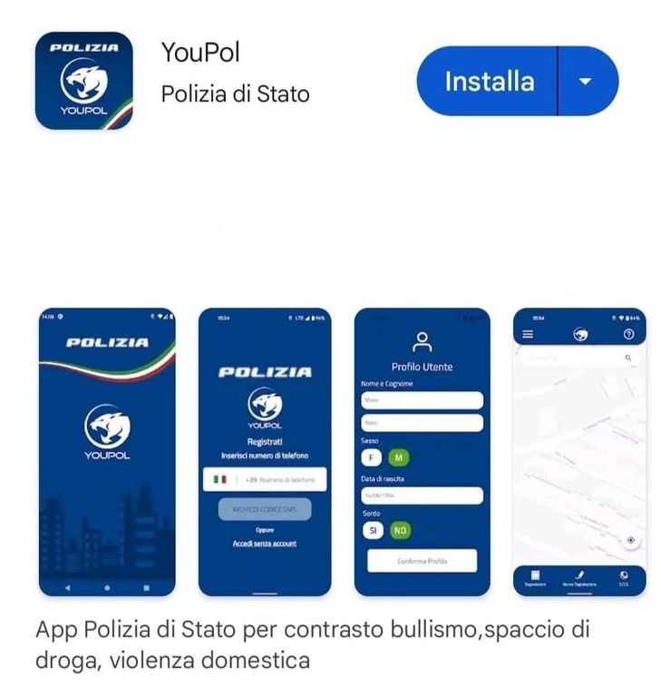 L’App YouPol è un’applicazione della Polizia di Stato nata nel 2017 per segnalare episodi di spaccio di droga e bullismo e nel 2023 è stata implementata anche con la possibilità di segnalare episodi di violenza domestica.