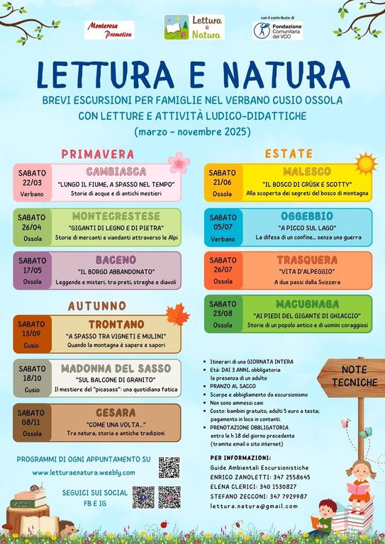 Si parte sabato 22 marzo a Cambiasca, sabato 26 aprile a Montecrestese e sabato 17 maggio a Baceno. Si prosegue poi in estate sabato 21 giungo a Malesco, sabato 5 luglio a Oggebbio, sabato 26 luglio a Trasquera e sabato 23 agosto a Macugnaga. Ultimi appuntamenti in autunno sabato 13 settembre a Trontano, sabato 18 ottobre a Madonna del Sasso, sabato 8 novembre a Cesara. I programmi specifici di ogni appuntamento si trovano sul sito www.letturaenatura.weebly.com e sui social Facebook e Instagram. Per informazioni è possibile contattare le guide all'indirizzo mail lettura.natura@gmail.com oppure tramite cellulare (Enrico Zanoletti 347 2558645, Elena Clerici 340 1530827, Stefano Zecconi 347 7929987).