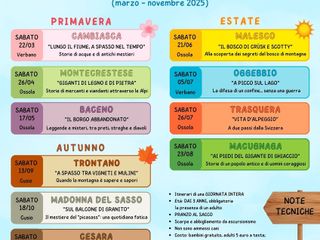 Si parte sabato 22 marzo a Cambiasca, sabato 26 aprile a Montecrestese e sabato 17 maggio a Baceno. Si prosegue poi in estate sabato 21 giungo a Malesco, sabato 5 luglio a Oggebbio, sabato 26 luglio a Trasquera e sabato 23 agosto a Macugnaga. Ultimi appuntamenti in autunno sabato 13 settembre a Trontano, sabato 18 ottobre a Madonna del Sasso, sabato 8 novembre a Cesara. I programmi specifici di ogni appuntamento si trovano sul sito www.letturaenatura.weebly.com e sui social Facebook e Instagram. Per informazioni è possibile contattare le guide all'indirizzo mail lettura.natura@gmail.com oppure tramite cellulare (Enrico Zanoletti 347 2558645, Elena Clerici 340 1530827, Stefano Zecconi 347 7929987).