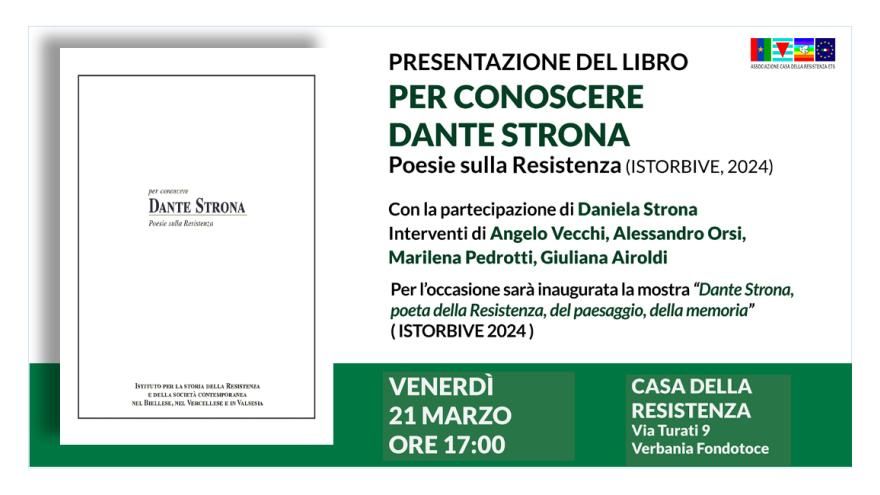 Venerdì 21 marzo alle ore 17:00 si terrà la presentazione del libro Per conoscere Dante Strona. Poesie sulla Resistenza (Istorbive 2024), un volume che raccoglie una selezione delle sue opere più significative. L’incontro vedrà la partecipazione di Daniela Strona e gli interventi di Angelo Vecchi, Alessandro Orsi, Marilena Pedrotti e Giuliana Airoldi.