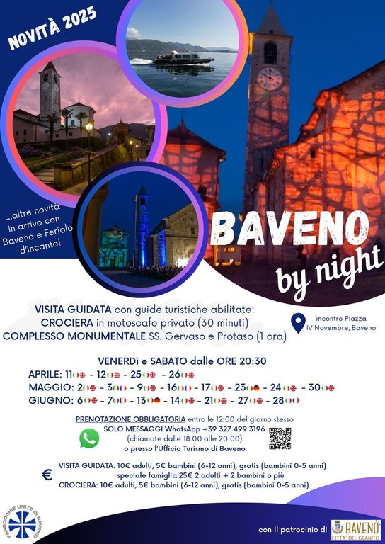 Dopo il successo riscosso la scorsa stagione, torna anche quest’anno “Baveno by night”, l’apertura serale del complesso monumentale promossa dalla parrocchia di Baveno. La chiesa dei Santi Gervaso e Protaso e il battistero di San Giovanni Battista saranno dunque visitabili nelle serate di venerdì e sabato a partire dall’11 aprile e per tutta la stagione turistica.