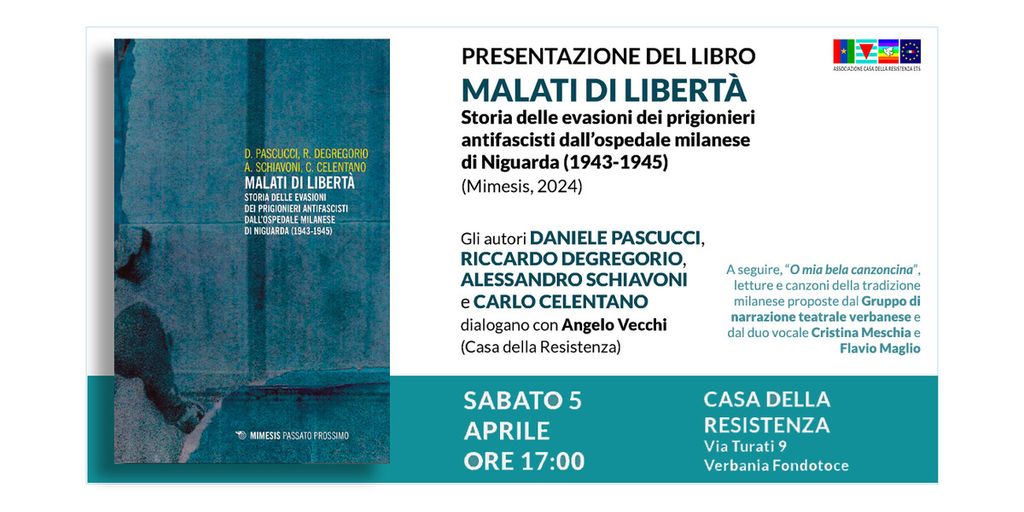 Sabato 5 aprile, alle ore 17:00, presso la sala conferenze di Verbania, si terrà la presentazione del libro Malati di libertà. Storia delle evasioni dei prigionieri antifascisti dall'ospedale milanese di Niguarda (1943-1945), edito da Mimesis. Gli autori Daniele Pascucci, Riccardo Degregorio, Alessandro Schiavoni e Carlo Celentano dialogheranno con Angelo Vecchi per approfondire le storie di coraggio e resistenza di quegli uomini che, durante gli anni bui della Seconda Guerra Mondiale, trovarono il coraggio di sfidare la morte per la libertà.