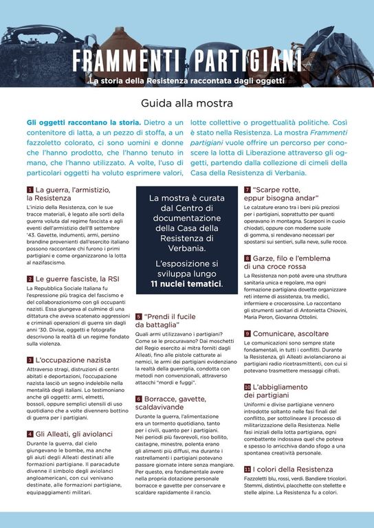 "Verranno poi analizzati singoli aspetti di vita quotidiana come l’alimentazione, l’abbigliamento, la sanità, gli armamenti, le comunicazioni, gli spostamenti e i colori della Resistenza. Ogni nucleo tematico potrà essere approfondito da testi, immagini, fotografie, documenti e testimonianze audiovisive". La mostra Frammenti partigiana verrà inaugurata con il concerto No alla guerra!, canti contro la guerra offerti dal gruppo di canto popolare ArSunàCanta.