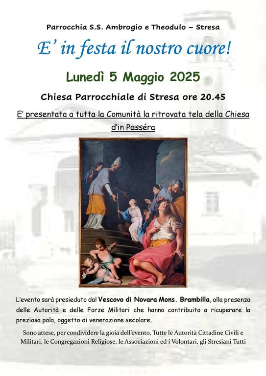 Domani sera, lunedì 5 maggio alle ore 20.45, nella chiesa parrocchiale di Stresa sarà presentata ufficialmente alla cittadinanza la pala “La presentazione di Maria al Tempio”, trafugata nel 2009 dalla chiesa della Madonna di Passèra e recuperata grazie all’intervento dei carabinieri.