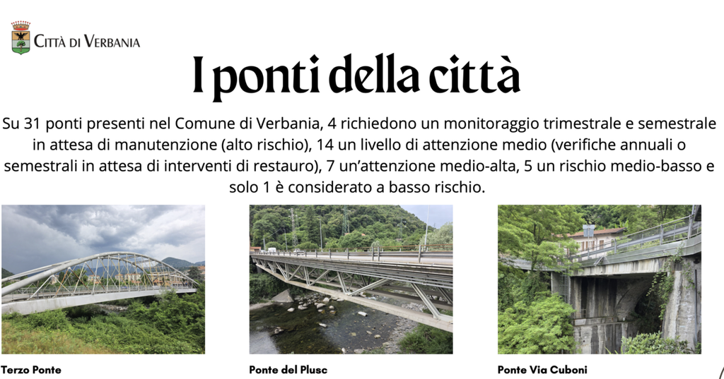 Ponti. Argomento oggetto di recente dibattito in Consiglio comunale. Su 31 ponti presenti a Verbania, 4 necessitano di monitoraggi trimestrali o semestrali, 14 richiedono un livello di attenzione medio (verifiche annuali o semestrali), 7 medio-alto, 5 medio-basso. I quattro con criticità maggiori sono: il ponte di via San Giovanni Bosco, il nuovo ponte del Plusc, l’ex ponte in sasso sul torrente San Giovanni e la passerella dietro la Casa della Resistenza. Tra quelli che richiedono attenzione medio-alta, il ponte tra via Olanda e via Valgrande Martire, inaugurato nel 2004.