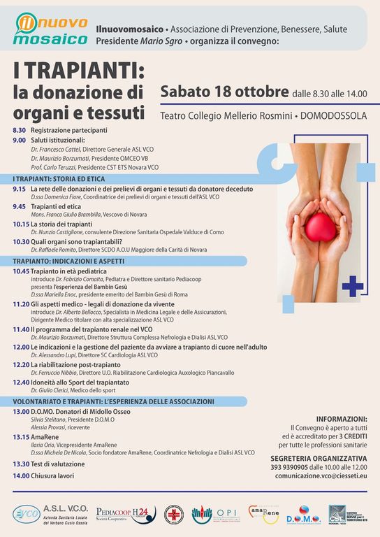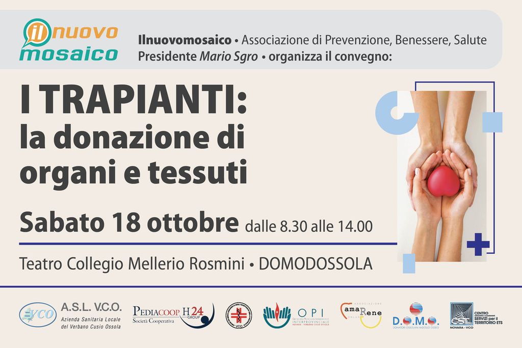 Appuntamento sabato 18 ottobre dalle 8.30 alle 14.00 presso il Teatro Collegio Rosmini a Domodossola con il convegno promosso da ilnuovomosaico in collaborazione con ASL VCO "I trapianti. La donazione di organi e tessuti". L'evento è aperto a tutti e accreditato per 3 Ecm alle professioni sanitarie.