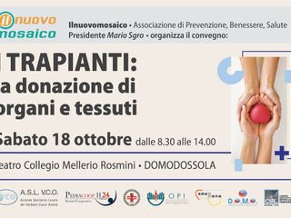 Appuntamento sabato 18 ottobre dalle 8.30 alle 14.00 presso il Teatro Collegio Rosmini a Domodossola con il convegno promosso da ilnuovomosaico in collaborazione con ASL VCO "I trapianti. La donazione di organi e tessuti". L'evento è aperto a tutti e accreditato per 3 Ecm alle professioni sanitarie.
