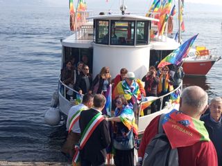 A dare il benvenuto agli “Artigiani di Pace”, l’associazione che ha promosso l’iniziativa, sono stati l’assessore alla Cultura di Verbania, Luciano Paretti; il sindaco di Vignone, Giacomo Archetti; Flavio Maglio, in rappresentanza di Anpi Verbania, e don Angelo Nigro, parroco di Ghiffa e promotore di diverse iniziative umanitarie in Terra Santa. Don Renato Sacco ha rivolto un breve discorso di benvenuto agli “Artigiani di Pace” appena sbarcati, spiegando il senso dell’iniziativa.