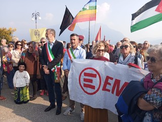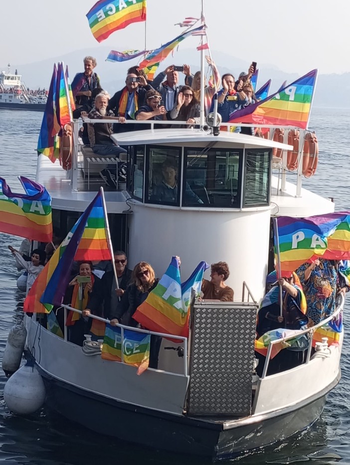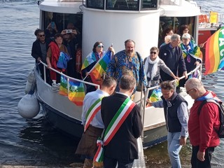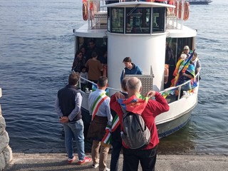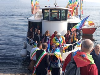 Approdo finale del Battello della Pace, alle 15.20 circa, sul lungo lago di Intra, al termine di una “rotta” partita da Angera con tappe intermedie ad Arona e Baveno. Una mini “Flottilla”, in continuità ideale con quella che, nei giorni scorsi, ha sfidato la marina militare israeliana.