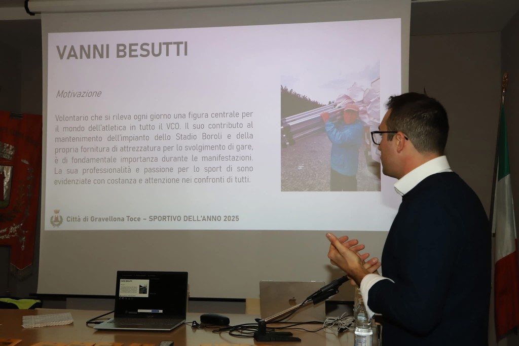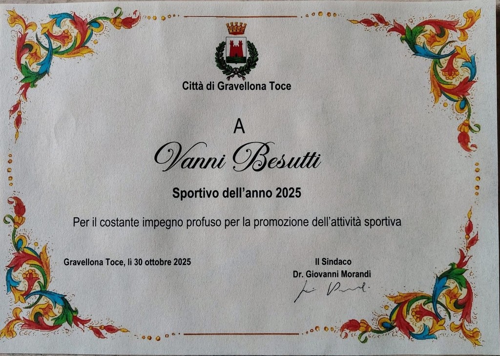 Vanni Besutti è stato scelto dall'apposita commissione come sportivo dell'anno 2025 del comune di Gravellona. Ieri sera in biblioteca la premiazione ufficiale: insieme a lui il riconoscimento è andato a Marco Cicchetti, atleta romano tesserato del Gsh Sempione '82, che ha ottenuto una lunga serie di risultati significativi a livello internazionale.