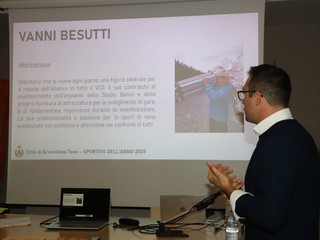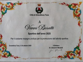 Vanni Besutti è stato scelto dall'apposita commissione come sportivo dell'anno 2025 del comune di Gravellona. Ieri sera in biblioteca la premiazione ufficiale: insieme a lui il riconoscimento è andato a Marco Cicchetti, atleta romano tesserato del Gsh Sempione '82, che ha ottenuto una lunga serie di risultati significativi a livello internazionale.