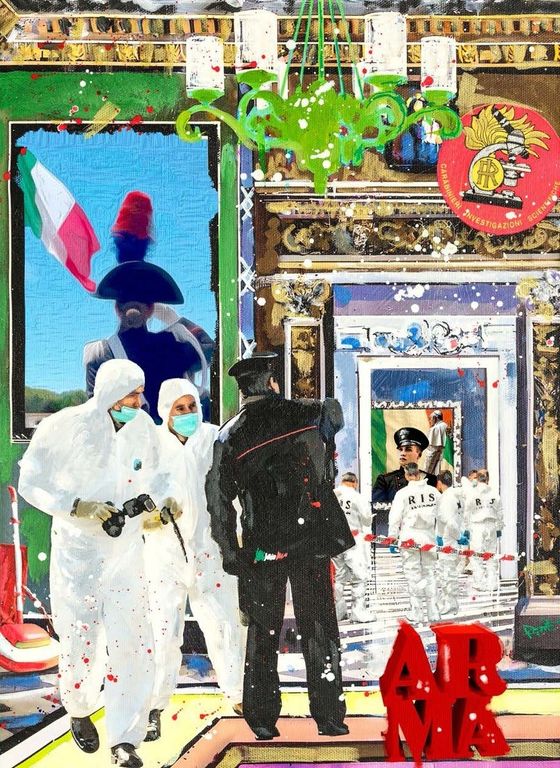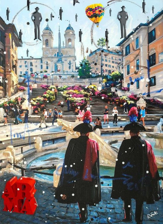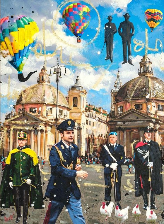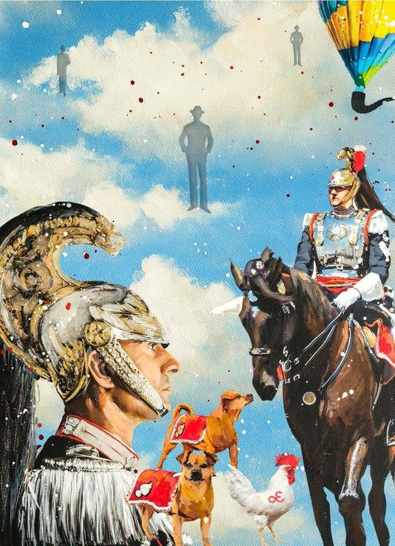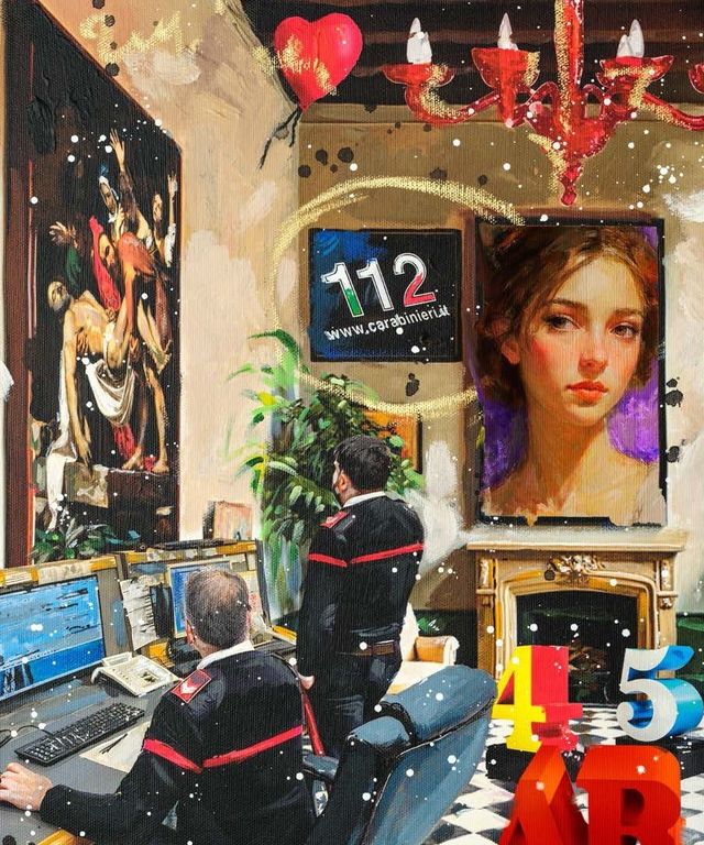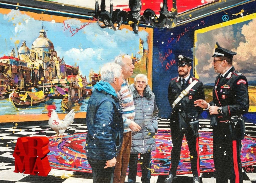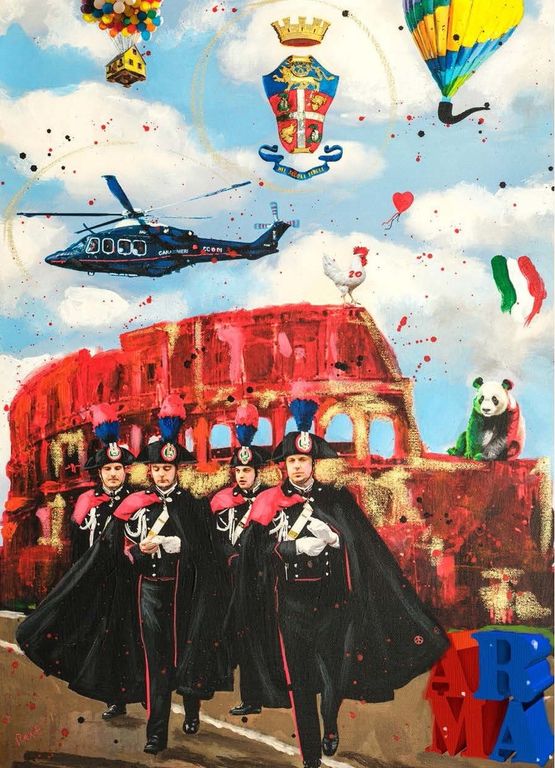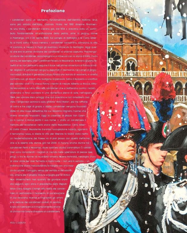 Le tavole, realizzate dall’artista René (Luigi Valeno), maestro della nuova pop art italiana, rappresentano con uno stile vivace e luminoso i carabinieri protagonisti della vita quotidiana del Paese. Ogni immagine mostra uomini e donne dell’arma nel pieno del loro servizio — tra la gente, nei centri urbani, nei paesaggi naturali e nei luoghi simbolo della cultura italiana — restituendo un’idea di presenza costante, dedizione e vicinanza al Paese. Le opere di René trasformano così il linguaggio della pop art in un omaggio alla quotidianità dei Carabinieri, celebrandone l’impegno, la professionalità e lo spirito di umanità che da sempre ne contraddistinguono la missione. I testi che accompagnano le diciannove tavole, affidati ancora una volta alla penna di Maurizio De Giovanni, costituiscono un racconto unitario, sviluppato attraverso la lettera di un giovane carabiniere, appena arruolato, che racconta ai suoi genitori le ragioni della sua scelta e l’esempio che ne trae. In essa il militare, con voce sincera e partecipe, narra episodi di generosità, slancio e altruismo che riassumono le difficoltà e le soddisfazioni di una scelta di vita fondata sul servizio al prossimo ed alla Nazione e le responsabilità di questa missione. Le parole del giovane, intrise di entusiasmo e di rispetto per la divisa, si intrecciano con episodi di altruismo e coraggio tratti dalla quotidianità, restituendo un mosaico di umanità e dedizione. Ogni tavola è così associata a un momento di crescita personale e professionale: un salvataggio, un gesto di solidarietà, una presenza discreta accanto a chi soffre, un’azione che riafferma la missione dei carabinieri come presidio di legalità e vicinanza alla popolazione. I testi diventano un viaggio nel cuore dell’Istituzione, un percorso che racconta non solo il mestiere del carabiniere ma anche la dimensione umana di chi lo interpreta. Il filo conduttore è la cura, intesa come dedizione quotidiana e silenziosa verso il prossimo. Le storie del giovane carabiniere si trasformano così in un dialogo affettuoso e morale con i suoi genitori, ma anche in un messaggio universale ai cittadini, un invito a credere nella bontà, nel coraggio e nella forza discreta di chi serve lo Stato con passione e onore. In ciascuna tavola, la parola si unisce all’immagine per esaltare il senso profondo della divisa: essere accanto a chi ha bisogno, in ogni circostanza, come autentici “eroi quotidiani”.