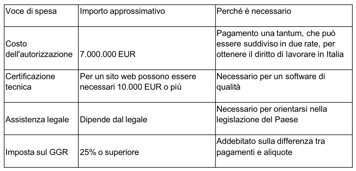 Un'altra sfida è rappresentata dal carico fiscale. In Italia, le imposte sul reddito lordo da gioco d'azzardo ammontano a circa il 25%, una percentuale piuttosto elevata anche rispetto agli standard europei. Tale onere, insieme all'alto costo delle licenze e alle spese operative necessarie per conformarsi alle norme regolamentari, incide notevolmente sulla redditività dell'attività. Ne risulta la situazione illustrata nella tabella seguente.