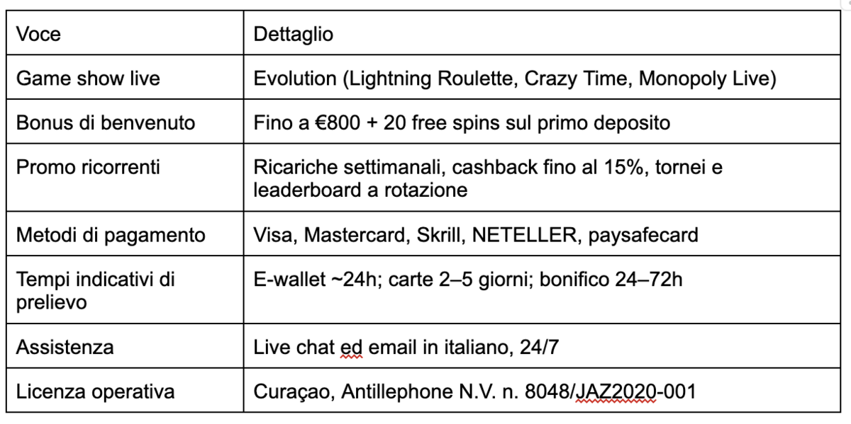 Qui sotto trovi una sintesi “da palinsesto”. Non è teoria: sono voci utili quando vuoi capire in 10 secondi cosa ti aspetta al prossimo show.