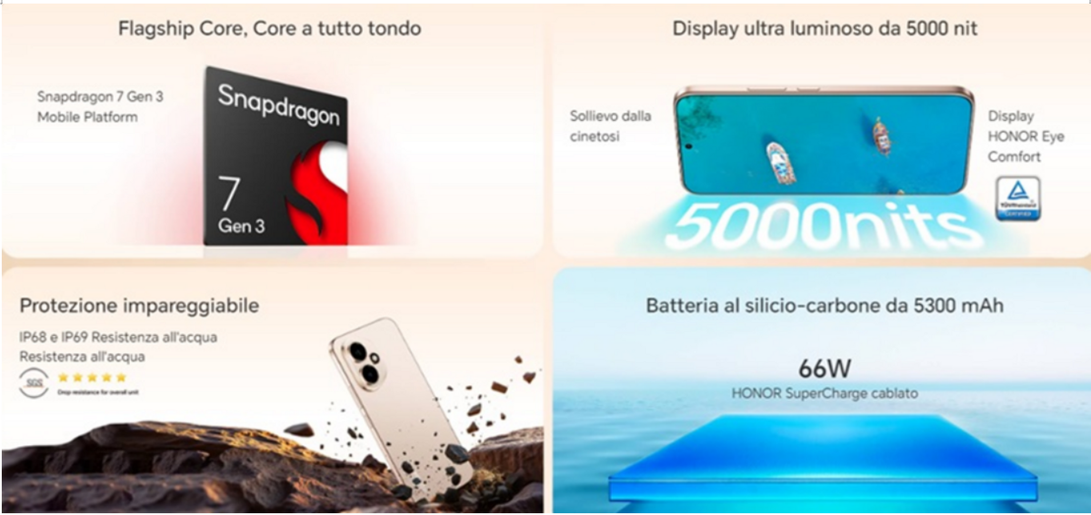 È uno schermo che si presta a ogni tipo di contenuto, dai video alle foto, fino alla lettura prolungata. Anche in ambienti molto luminosi, la visibilità resta ottima. In più, HONOR si prende cura degli occhi degli utenti e ogni suo modello dispone di diverse tecnologie, garantendo una protezione costante per la vista.