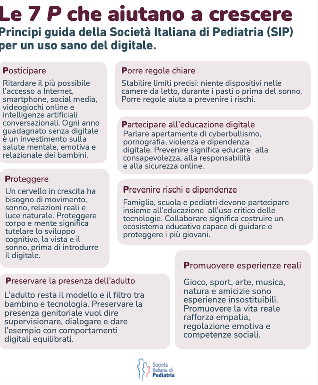 Le raccomandazioni SIP si rifanno ai principi guida della SIP: posticipare l’esposizione digitale, proteggere corpo e mente, promuovere esperienze reali e preservare la centralità dell’adulto. La tecnologia è uno strumento straordinario, ma deve entrare nella vita dei ragazzi al momento giusto, quando hanno la maturità per gestirla. Accompagnarli in questo percorso è una responsabilità condivisa tra famiglie, scuola e pediatri (vedere scheda le 7 P che aiutano a crescere).