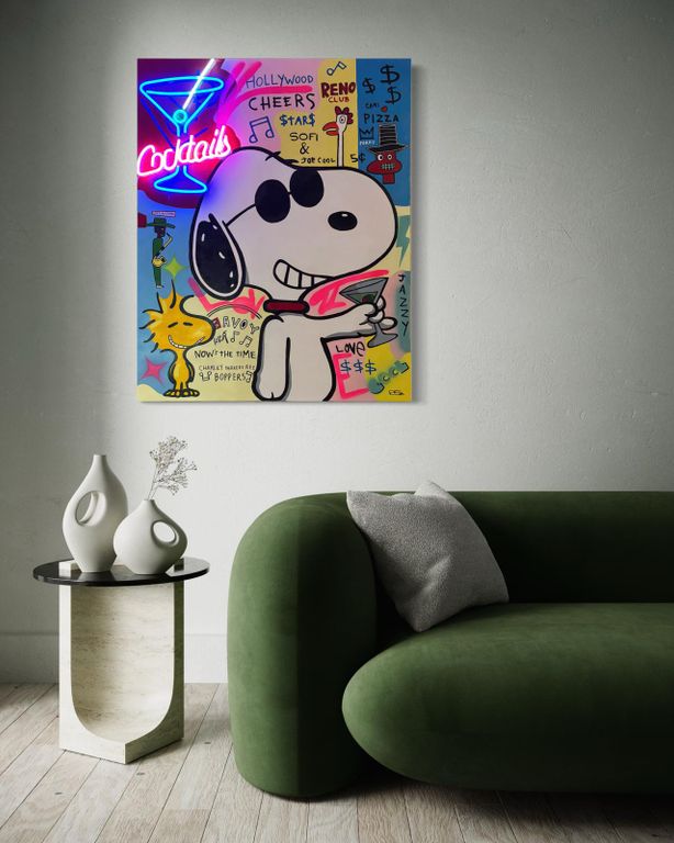 I protagonisti, da Snoopy a Homer Simpson, da Diabolik a Wonder Woman, fino alle atmosfere sognanti di Audrey Hepburn, non sono citazioni pop fini a sé stesse, ma specchi narrativi: frammenti di vita che oscillano tra ironia, nostalgia e intimità. Le opere si muovono così tra leggerezza e profondità. “Cocktails”, la prima tela dell’artista, è un brindisi di colori e libertà; “Chill” è un invito alla semplicità del sentirsi bene; “Good Times” custodisce il ricordo luminoso di un viaggio; “Life is a Party” trasforma Mickey e Snoopy in un inno alla gioia; “LOVE Code” mette in scena la tensione segreta tra Diabolik ed Eva, accesa da un neon che diventa dichiarazione.