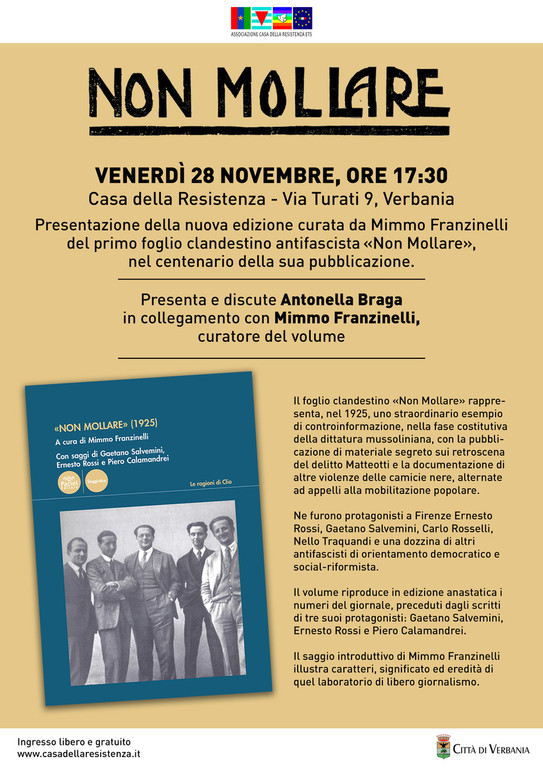 Venerdì 28 novembre alle ore 17:30 alla Casa dell Resistenza in via Turati 9 a Verbania, si terrà la presentazione della nuova edizione del primo foglio clandestino antifascista «Non Mollare» (1925), curata da Mimmo Franzinelli. Il volume, pubblicato nel 2025 da Pacini Editorein occasione del centenario, è arricchito da un saggio introduttivo dello stesso curatore, che ne ricostruisce il valore storico, l’eredità culturale e il ruolo pionieristico nel panorama del libero giornalismo.