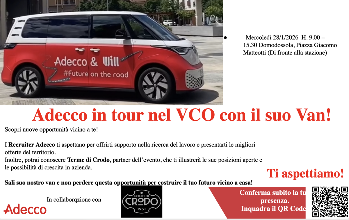 Domodossola, 26 gennaio 2026 – La Val d’Ossola si prepara ad accogliere la prossima tappa nel tour del van 100% elettrico di Adecco, società specializzata di The Adecco Group che sviluppa e valorizza il capitale umano. Il 28 gennaio, la filiale mobile sosterà in Piazza Matteotti a Domodossola, con l’obiettivo di favorire l’incontro tra i talenti e le opportunità di una delle principali realtà sul territorio.