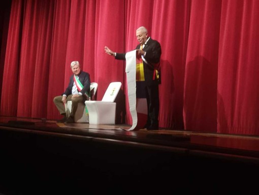 Come “trono”, due tazze da wc sulle quali alternarsi ad ogni scroscio d’acqua. Questo lo scherzo di Carnevale di Pacian XXXI, al secolo Claudio Loraschi, al sindaco di Verbania Giandomenico Albertella durante la serata di apertura del Carnevale verbanese andata in scena ieri, 12 febbraio, al teatro Il Maggiore. Un “omaggio” alla doppia carica istituzionale di sindaco e presidente della provincia.