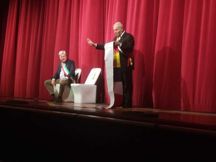 Come “trono”, due tazze da wc sulle quali alternarsi ad ogni scroscio d’acqua. Questo lo scherzo di Carnevale di Pacian XXXI, al secolo Claudio Loraschi, al sindaco di Verbania Giandomenico Albertella durante la serata di apertura del Carnevale verbanese andata in scena ieri, 12 febbraio, al teatro Il Maggiore. Un “omaggio” alla doppia carica istituzionale di sindaco e presidente della provincia.