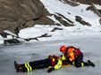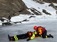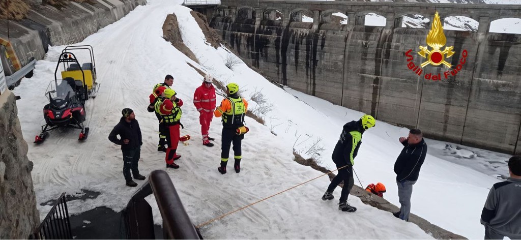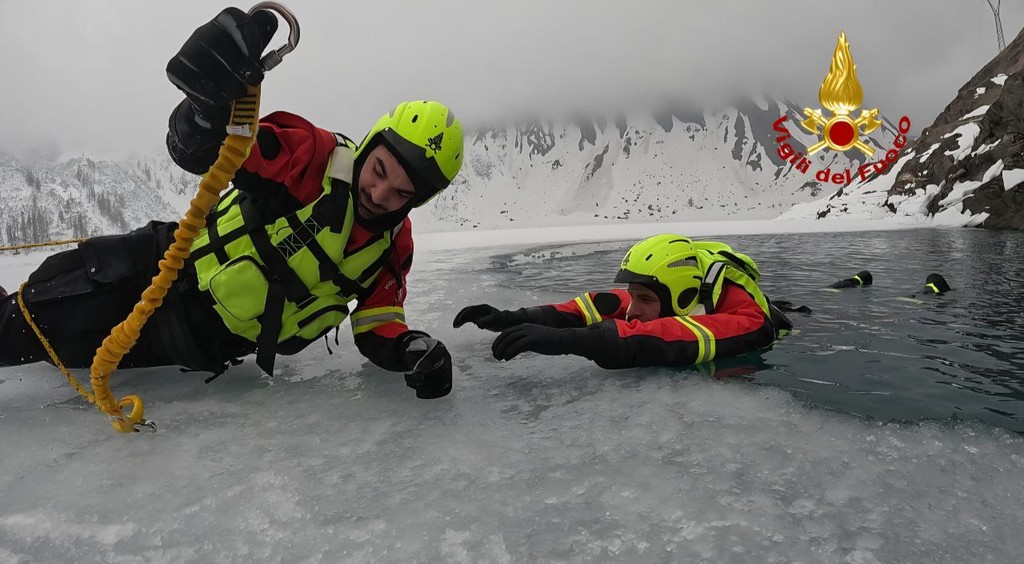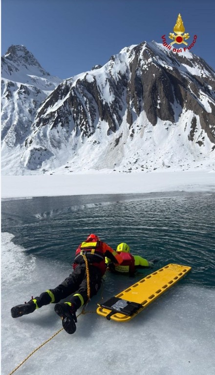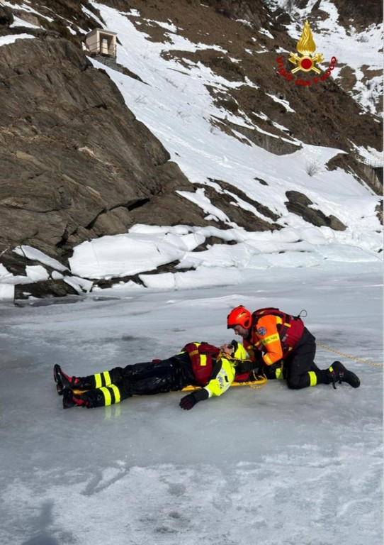 Durante l’addestramento è stato simulato l’incidente di un operaio impegnato nelle attività sugli invasi idrici della zona, utilizzati per la produzione di energia elettrica, caduto in acqua a seguito del cedimento della coltre di ghiaccio che ricopriva il lago.