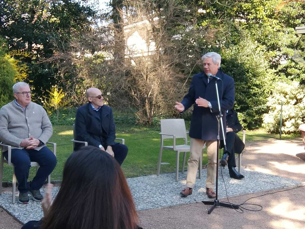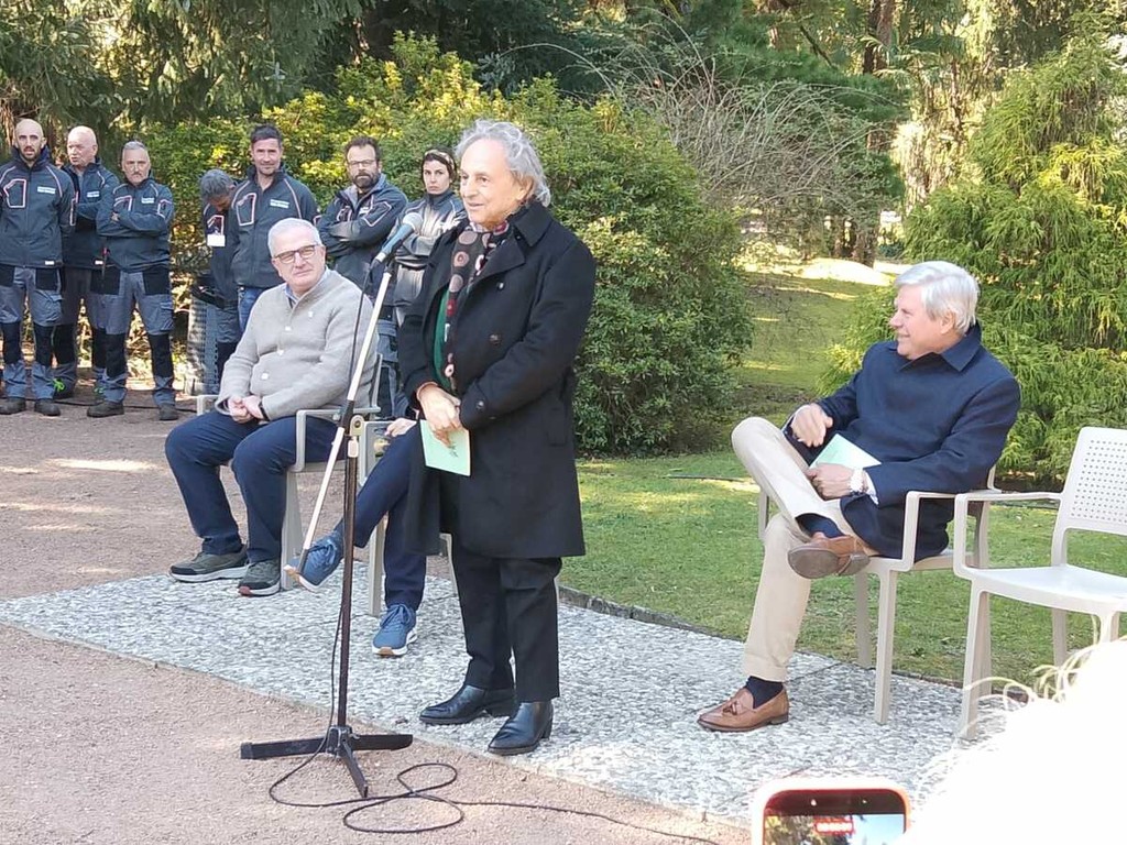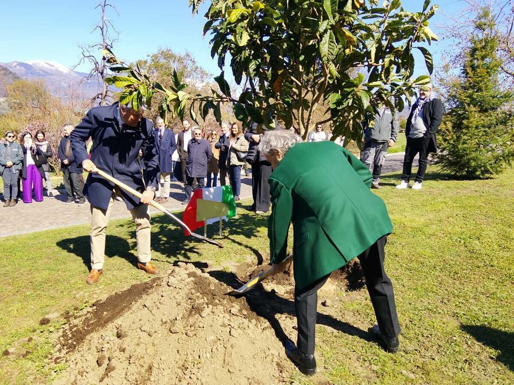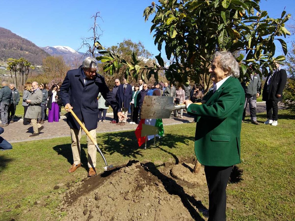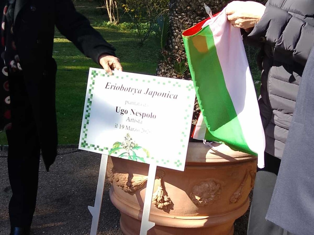 Si è conclusa con la messa a dimore dell’esemplare di Eriobotrya Japonica da parte dell’artista Ugo Nespolo e di Giandomenico Albertella, sindaco di Verbania e presidente dell’ente, l’inaugurazione della stagione 2026 dei giardini botanici di Villa Taranto. Eriobotrya Japonica è la definizione scientifica della pianta del nespolo: la città di Verbania ed l’ente giardini hanno deciso di dedicare la pianta e una targa a Ugo Nespolo, come segno di ringraziamento per “Universo Nespolo”, l’antologica dell’artista ospitata a Villa Giulia. Sulla dedica, Nespolo ci ha scherzato un po’ su: “Sarò vicino di casa di un personaggio poco conosciuto, Adenauer…”. La targa che ricorda la visita a Villa Tarando del cancelliere tedesco, tra i fondatori della Comunità Europea, è alle spalle di quella della pianta dedicata a Nespolo.