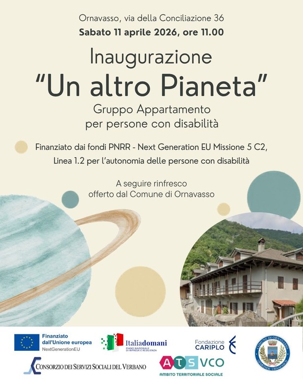 Sarà inaugurata sabato 11 aprile alle ore 11 a Ornavasso, in via Conciliazione 36, la “Casa Rurale Basso Toce”, nuovo spazio dedicato all’accoglienza e all’autonomia delle persone con disabilità. La struttura ospiterà il gruppo appartamento denominato “Un altro pianeta”, progetto pensato per offrire percorsi di vita indipendente ai giovani del territorio.