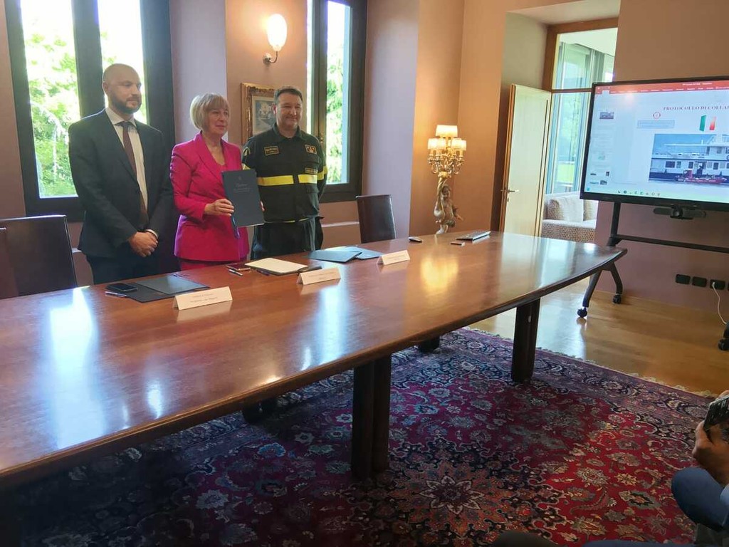 Il comandante provinciale dei Vigili del Fuoco, ingegner Onofrio Lorusso, e il direttore di gestione dalla Navigazione Lago Maggiore di Arona, Claudio Bermano, hanno firmato questa mattina in Prefettura un protocollo d’intesa sulla sicurezza dei natanti di linea. “L’intento – ha spiegato poco prima della firma Lorusso – è quello di aumentare l’efficacia e l’efficienza dei servizi di sicurezza sul lago. Siamo il solo comando provinciale ad avere una sede sul lago, operiamo con il comando provinciale e i distaccamenti volontari di Stresa e Cannobio nel soccorso alle persone, nel recupero natanti, nel controllo sul rispetto della normativa in materia di navigazione”.