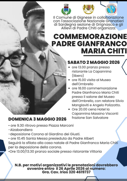 Due giornate di iniziative per rendere omaggio a Padre Gianfranco Maria Chiti. Il Comune di Gignese, in collaborazione con l’Associazione Nazionale Granatieri di Sardegna – sezione di Grignasco – e gli Allievi di Padre Chiti, organizza per sabato 2 e domenica 3 maggio 2026 un ricco programma di commemorazioni dedicate alla figura del religioso.