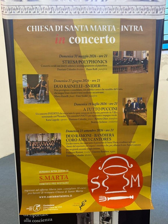 La stagione 2026 prevede quattro concerti, tutti alle ore 21. Si parte il 31 maggio con gli “Stresa Polyphonics”. Il 27 giugno sarà la volta del duo formato da Marco Rainelli al flauto ed Ester Snider al pianoforte. Il 18 luglio spazio a “Tutto Puccini” con la soprano Katia Lippolis e il tenore Damiano Colombo, accompagnati al pianoforte da Roberto Olzer, con la conduzione della giornalista Beatrice Archesso. Gran finale il 21 settembre con il debutto del duo Francesco Ramoni (tromba) e Giacomo Bandiera (organo), insieme agli Amici Cantores diretti da Colombo.